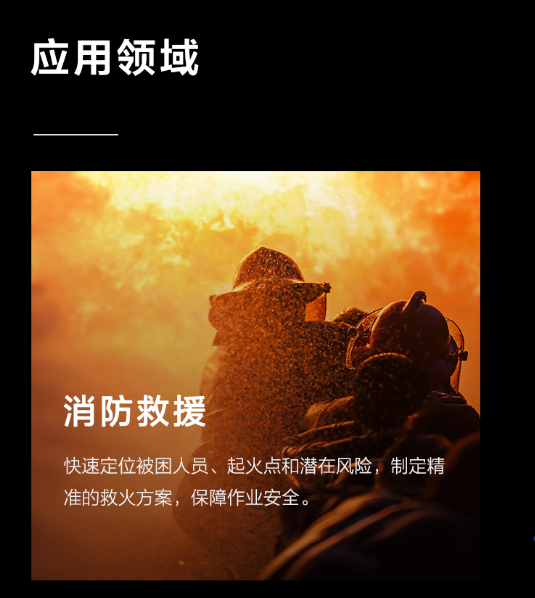 应用领域广泛:消防救援,快速定位被困人员,起火点和潜在风险,制定精准的救火方案,保障作业安全;应急搜救,扫描搜索区域,迅速定位救援对象,及时营救;警务执法,在抓捕、侦察等执法场景中,高效获取信息并快速决策,保障人员安全;能源巡检,高效识别设备的缺陷和隐患,精准掌握设备的运行状态,提升巡检效率及运维水平;环境保护,监控环境变化,协助野生动物保护。